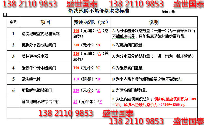 我公司为方便天津市民解决地暖不热与天津地暖清洗等问题,现将价格公布如下: